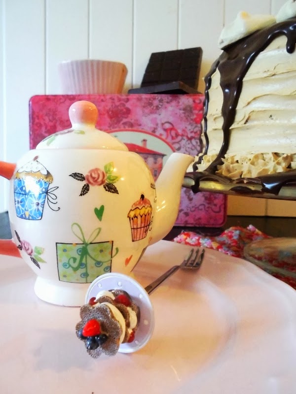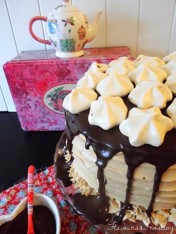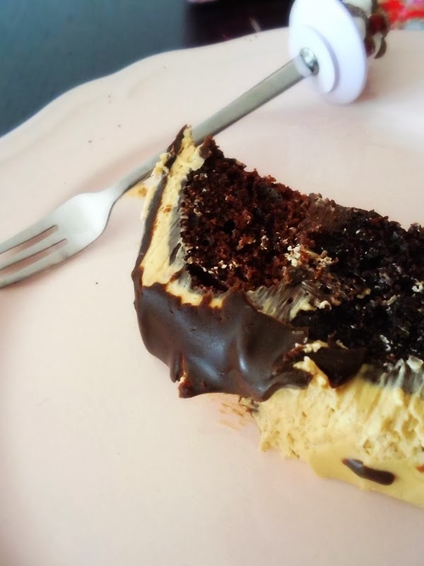 If you like chocolate combined with coffee this cake is for you.. it´s a layer chocolate cake filled with dark chocolate ganache and covered with coffee frosting.. awhile ago, friends of ours gave us Starbucks coffee as a gift so I decided to use some of it to make the frosting.. the result was even better than I thought.. if you like Starbucks coffee as much as I do (and believe me where we are it´s hard to come by..) you´ll love it but please don´t think that you cant use any other coffee, because you can.. I just like Starbucks so I used it but you could use whichever you like..