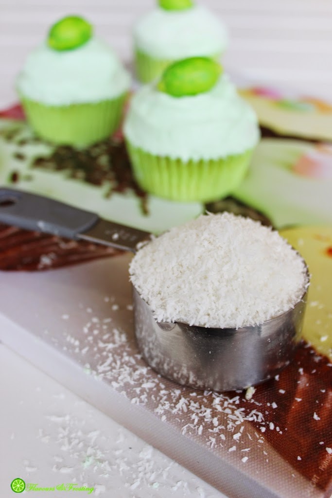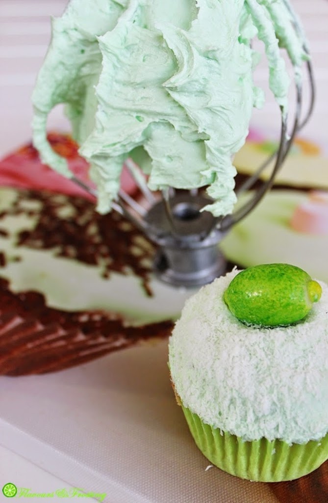 Mix the butter until creamy and slowly add the sifted icing sugar & salt until well mixed. Add the lime syrup and green gel colourant. When your cupcakes are cooled frost them with the frosting and lastly roll them into the coconut.. and you´re done!!