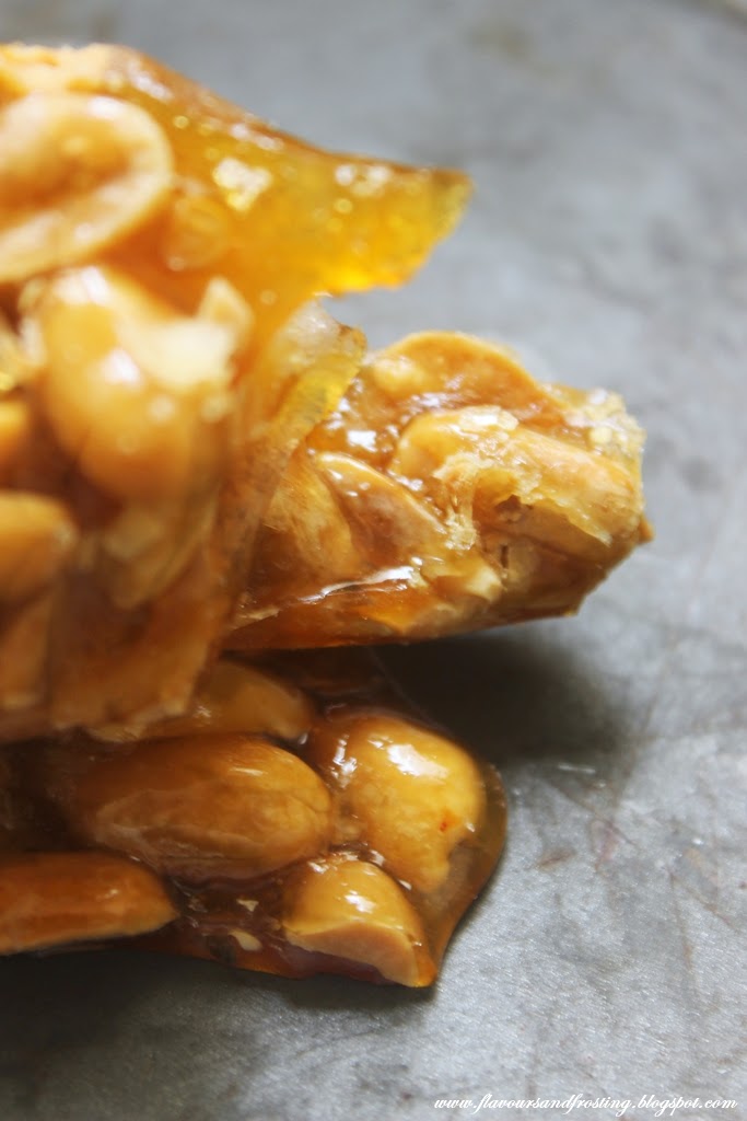 Prepare a baking tray with a sheet of wax paper. Heat the sugar and water on medium high heat until the mixture turns into a golden colour, put the heat off and immediately add the vanilla and peanuts. Work fast. Scoop the mixture onto the prepared wax paper and flatten with the back of your wooden spoon. Allow to cool/harden at room temperature. When cooled, put into a zip-lock bag and chop into pieces with your wooden rolling pin.