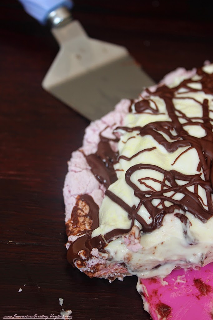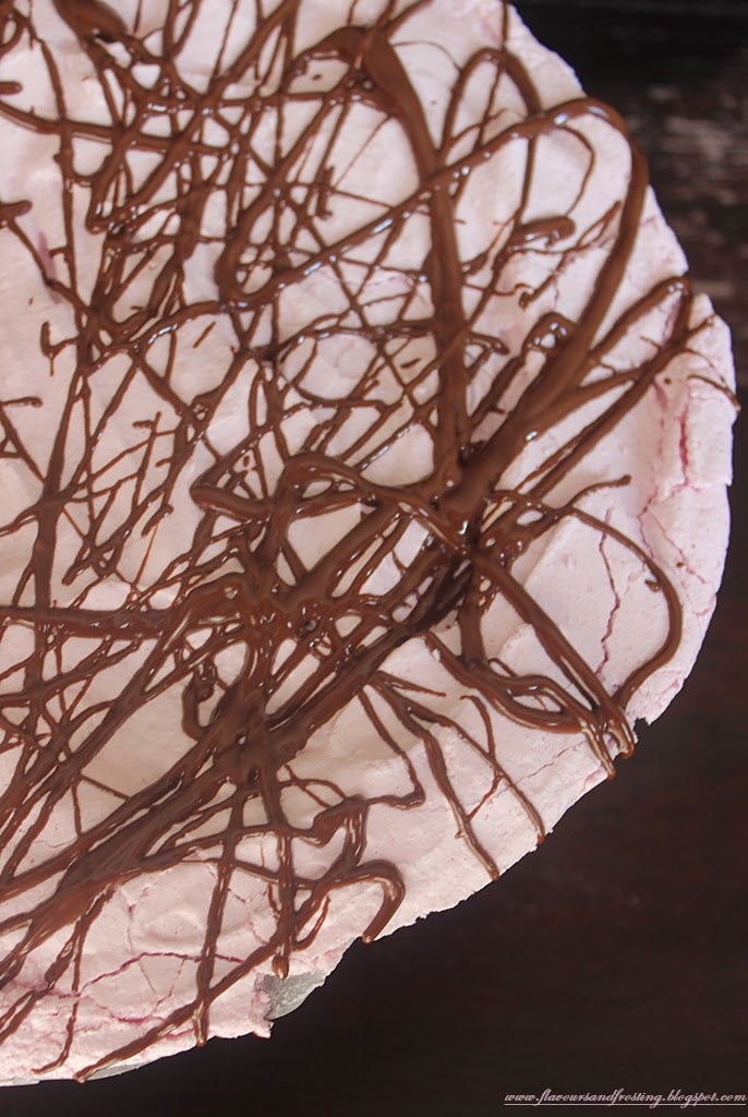 Assembling this dessert was simply melting some rich dark chocolate and drizzling it over the cooled meringue base (as in the photo below), adding the whipped cream and cream cheese topping and to top it off some strawberries (I used canned strawberries) and then some more chocolate drizzled on the top.. y VOILA!
