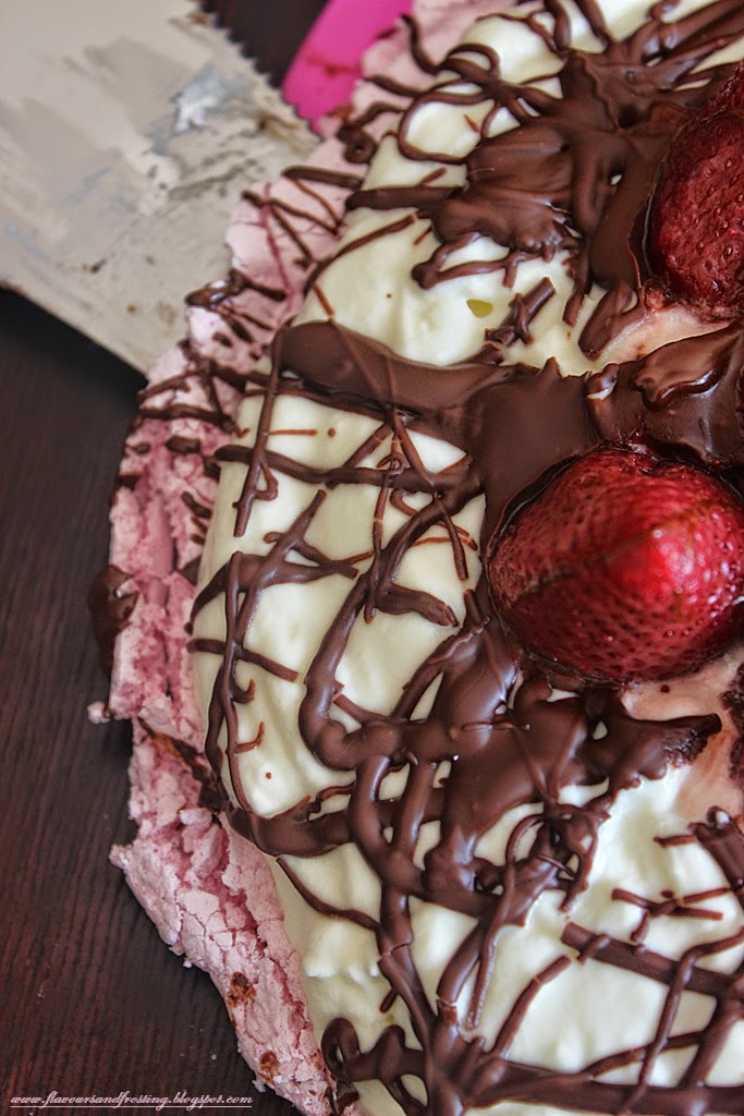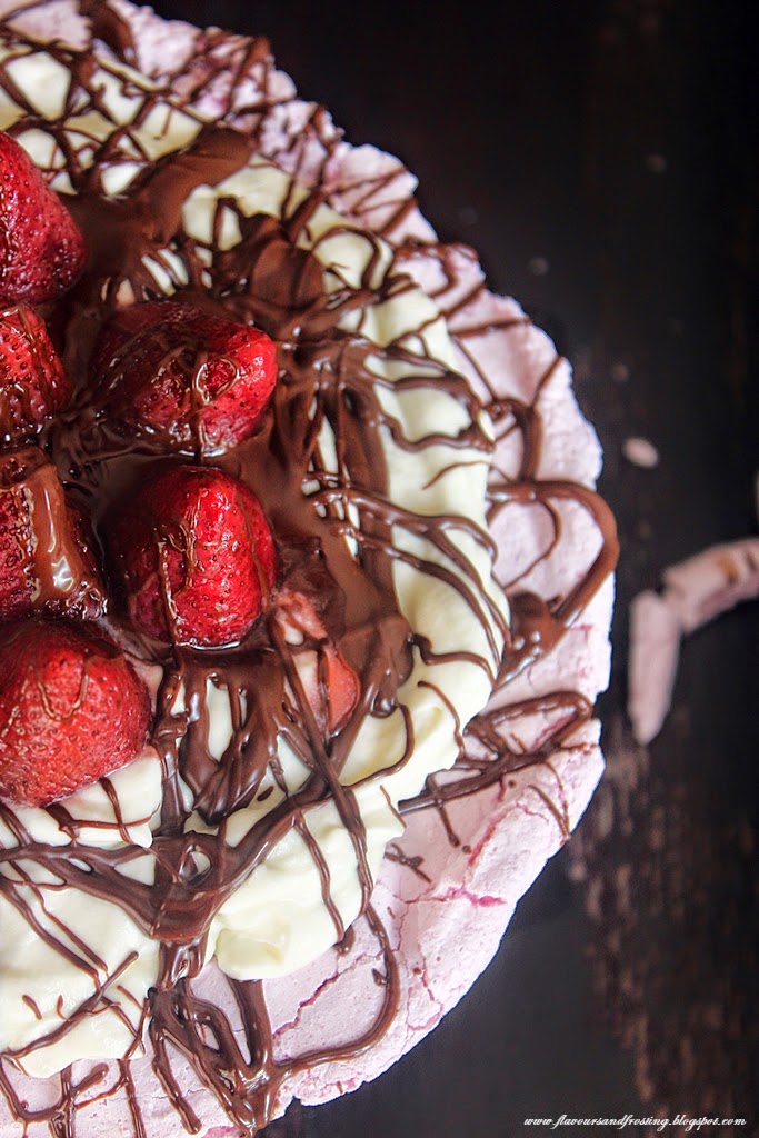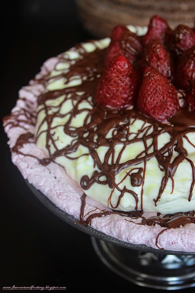 Pavlova topped with fresh strawberries, melted chocolate and topped with a delicious cream cheese topping. Super delicious!
