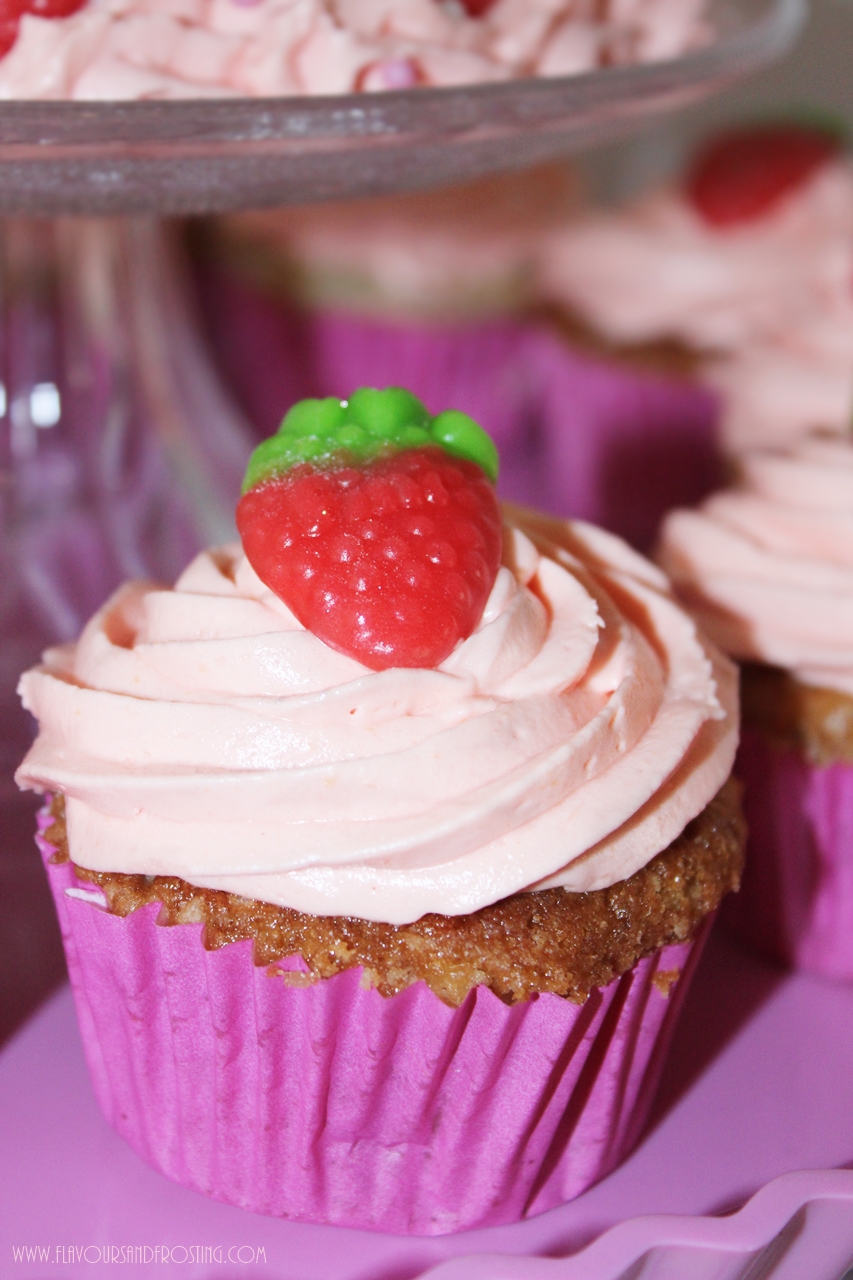 - A mini cake (3 levels) + cupcakes that I made with an easy strawberry sponge cake recipe, filled and frosted with high quality strawberry preserve + french meringue buttercream, and decorated with strawberry gummies.