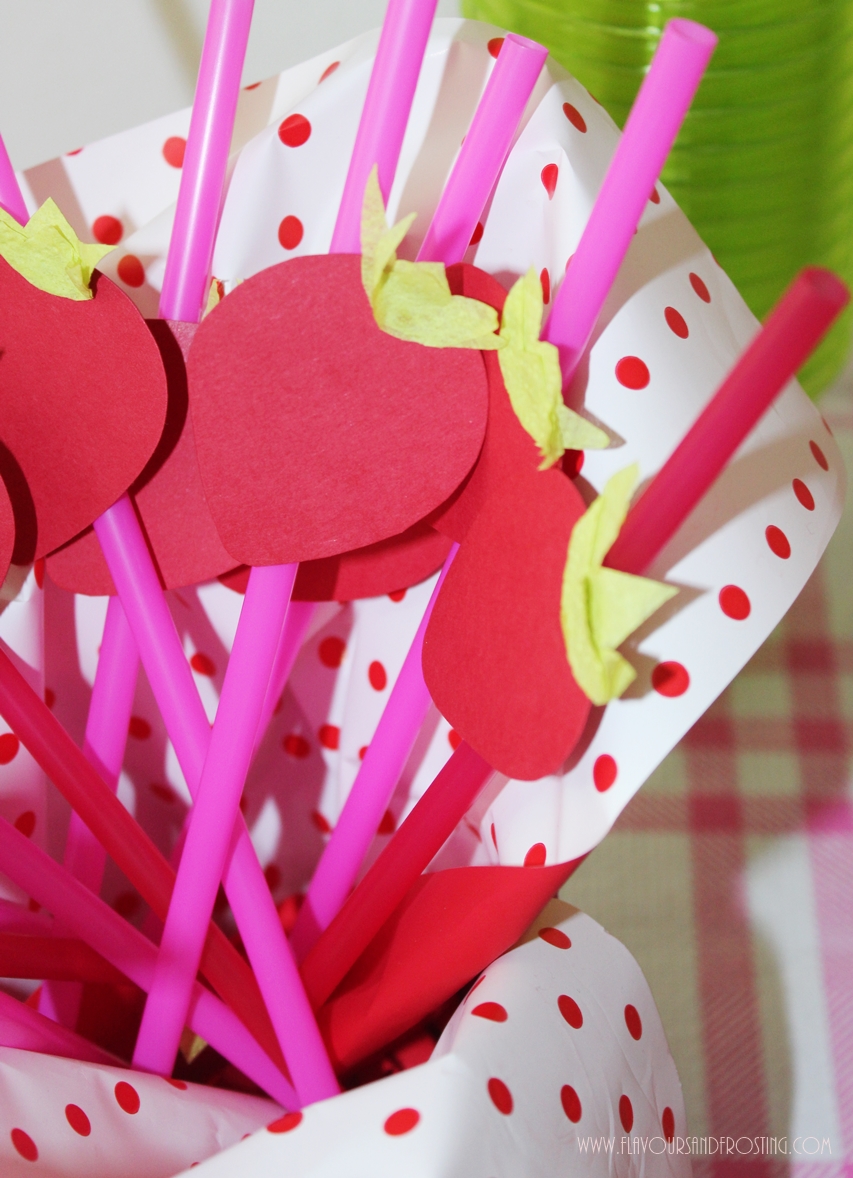 - 3 x small strawberries, like the ones you made above for the straws (I only used 3 because I made a mini cake). Instead of 3 solid colors, you could also add white and red polka dot strawberries (see image below)